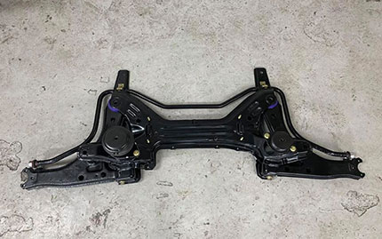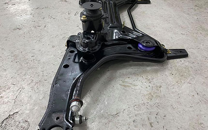 With the Corrado raised on a 2 post lift, we were able to strip out all components requiring attention. Subframes, rear beam, suspension, brakes, starter motor, gearbox, fuel tank straps, front bumper, front panel, radiator, inlet manifold, exhaust system etc, all removed. Gearbox was stripped and inspected and reassembled with Quaife LSD and other new parts as required. Subframes and rear beam, tank straps, front crossmember and many other components stripped down and blast cleaned, before being powder coated and rebuilt with all new bushes, bearings, links etc. All nuts, bolts, brackets etc, sent to our electroplaters for chemical cleaning and replating zinc and colour or passivate as it is otherwise known.